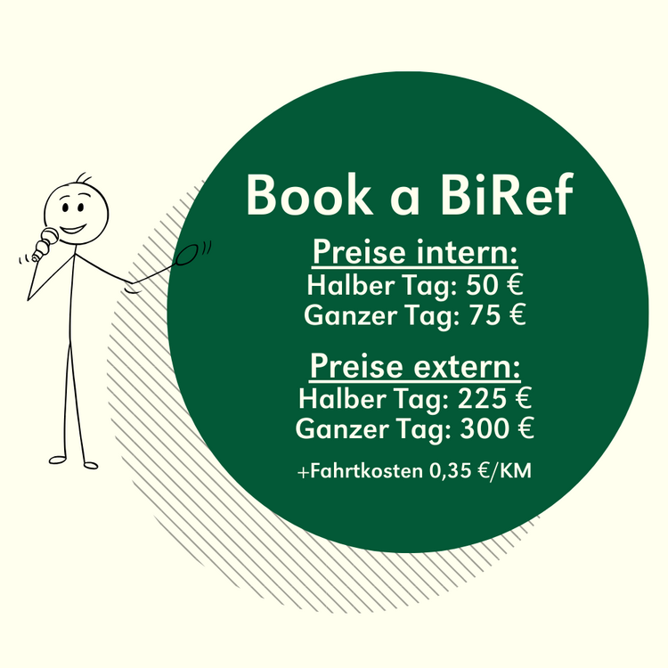 Ihr plant einen Vortrag, eine Workshop oder ein anderes Angebot und braucht dabei Hilfe? “Bucht” unsere BiRefs Jule und David zu eurer Unterstützung! Wenn ihr interessiert seid, ruft ihr uns am besten mal an oder schreibt eine Mail. Dann besprechen wir die Detailfragen (Inhalte, Termin, Kosten, etc.).
